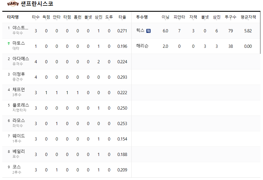 이날 경기는 투수전으로 진행되었습니다. 자이언츠의 선발 투수 힉스는 6이닝 동안 7피안타, 3실점, 6탈삼진을 기록하며 호투했지만, 팀 타선의 지원을 받지 못해 패전 투수가 되었습니다.