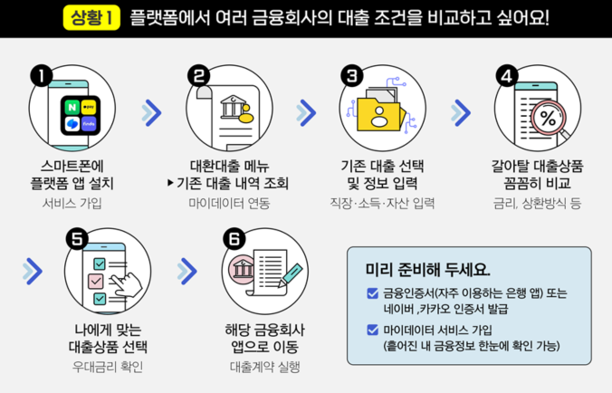 보다 원활하게 서비스를 이용하려면 사전에 대출 갈아타기를 제공하는 앱을 앱스토어‧구글 플레이 스토어에서 설치해 두는 것이 좋습니다. 플랫폼 앱을 이용하려는 경우, 해당 플랫폼 내에서 마이데이터 서비스에 미리 가입해 두면 갈아타는 데 걸리는 시간을 줄일 수 있습니다.