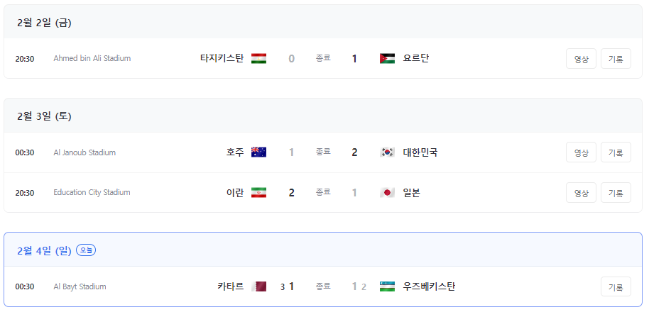 아시안컵 8강 대진표 및 경기 결과