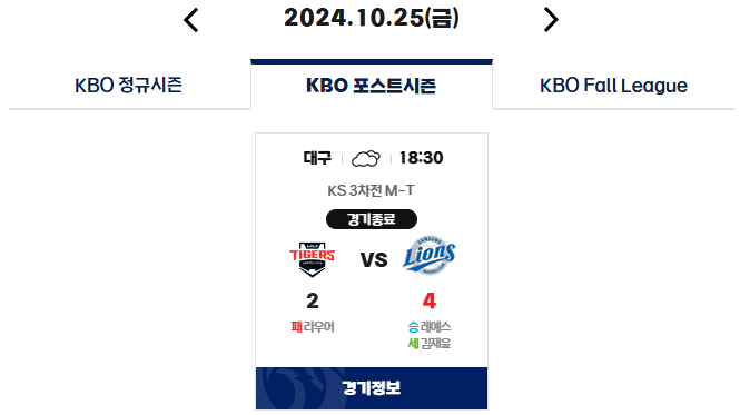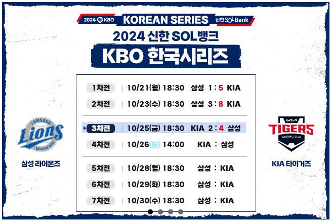 2024 KBO 한국 프로야구 포스트시즌 결승 한국시리즈가 진행되고 있습니다. 10월25일(금) 18:30에 3차전이 진행되었는데요. 오늘의 경기 결과 바로 함께 보도록 할께요. 추가로 지난 경기 하이라이트, 인터뷰, 재미있는 영상들도 함께 보시고 대진표도 아래에서 보실 수 있습니다.